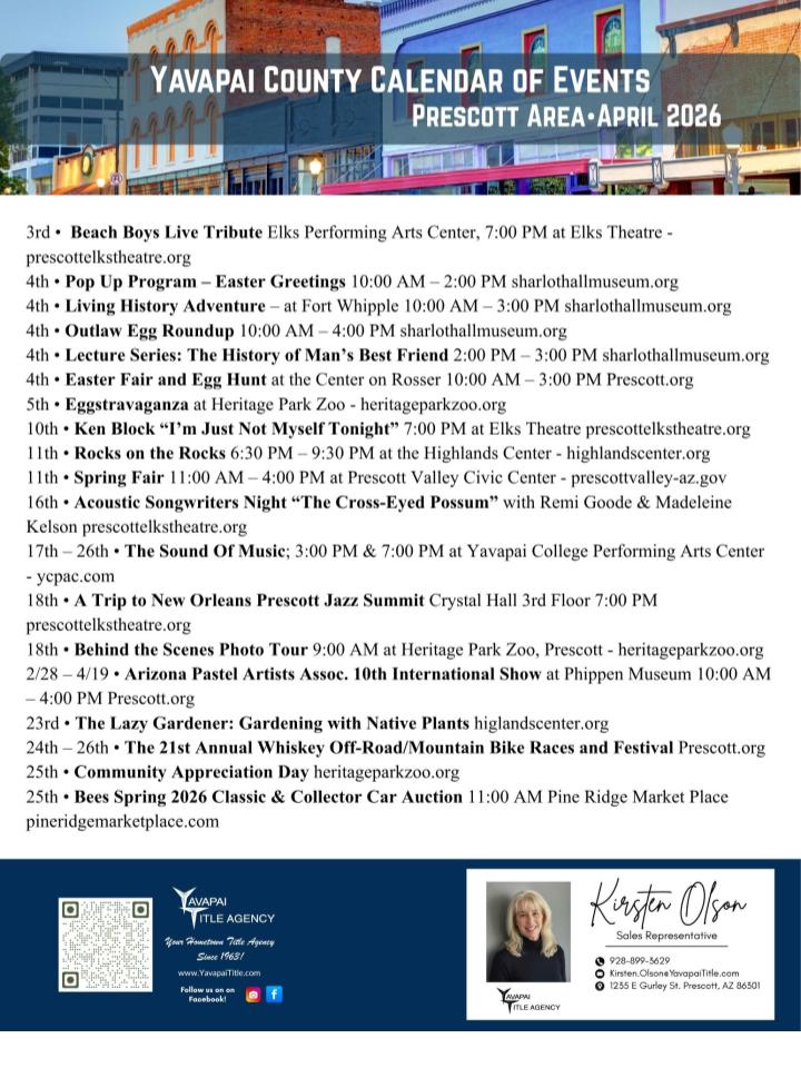 Prescott AZ Event Calendar – April 2026 Click image above to download PDF Pickle411 | Wine Downs | Relocation Center | Seller's Corner | Search Site